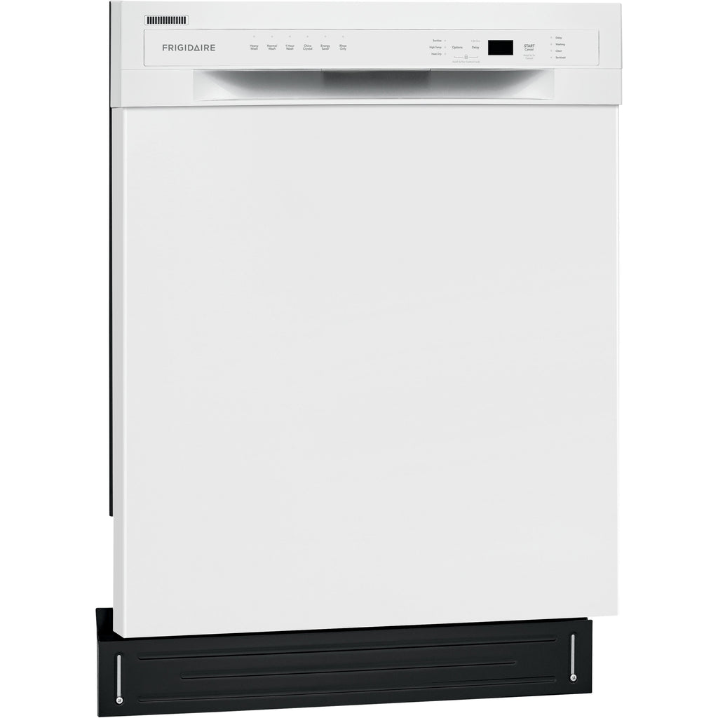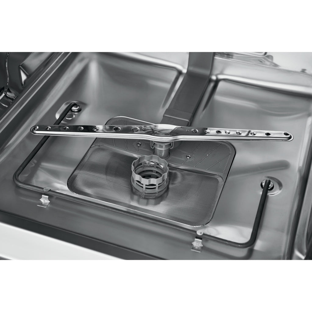 Self-cleaning filter eliminates food particles, keeping dishes clean.