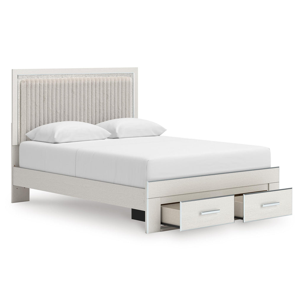 • Includes upholstered panel headboard, storage footboard, roll slats and platform rails