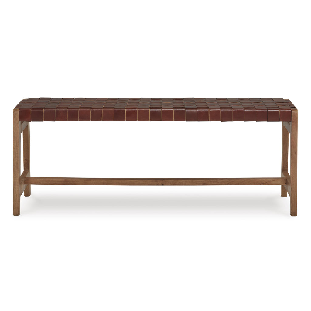 Express your sense of contemporary yet comfortable style with this accent bench. Its on-trend frame is accented by brown leather... Express your sense of contemporary yet comfortable style with this accent bench. Its on-trend frame is accented by brown leather strips in a basket weave pattern for a mid-century modern aesthetic. Tuck this modern gem into an entryway or home office. View more